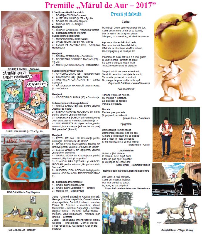 Vineri 31 martie 2017, ora 10 şi 13 minute, uşile Casei de Cultură a Sindicatelor din Bistriţa se deschid şi încep să-şi facă apariţia Cornel Udrea, cu Gheorghe Căpuşan de la Cluj. Pe rând, apar: Virgil Raţiu, Grigore Chitul, Menuţ Maximinain, Elena M. Câmpan şi nu în ultimul rând, soseşte George Corbu – preşedintele juriului, însoţit de directorul festivalului. Adică de mine, Alexandru Câţcăuan. Juriul era complet şi puteau să înceapă notarea şi ierarhizarea lucrărilor la secţiunea de concurs Creaţie literară. S-a început cu subsecţiunea manuscrise, epigramă. Nu ştiu de ce, epigrama poartă moţ, mai ceva decât celelalte genuri satirice, schiţe, rondeluri, fabule etc. Tema acestei subsecţiuni a fost „Pas cu popas”. Bună, rea, aşa a fost fixată într-o discuţie mai veche. La această subsecţiune, din 33 de epigramişti participanţi, s-au acordat trei Premii egale la următorii: Ion Moraru din Galaţi, Nichi Ursei din Râmnicu Vâlcea şi Slavu Petronela din Aninoasa, Hunedoara. S-au acordat şi trei menţiuni lui: Petre Brumă din Constanţa, Grigore Marian Dobrogeanu din Târgu Jiu şi Valeria Moroşan din Vatra Dornei. Iată, aşadar, faţă de ediţiile anterioare, două nume noi. La subsecţiunea proză/fabulă/rondel s-au acordat patru Premii egale: Any Drăgoianu, din Ţânţăreni, Gorj, Ioan Şiman din Baia Mare, Cătălina Orşivinschi din Vama, Suceava şi lui Marian Răţulescu (Radu Marini) din Craiova. (Notă – Prima prezenţă a lui Marian Răţulescu la Bistriţa a fost la ediţie I a Festivalului, 1983, când făcea parte din Grupul de Satiră „Pro Parodia” din Craiova, câştigător atunci a Marelui Premiu „Mărul de Aur”.) S-a acordat şi o singură menţiune, pentru Claudia Croitoru din Constanţa. La subsecţiunea Volume publicate s-au acordat patru Premii egale: Vasile Larco din Iaşi, pentru volumul „Rochia de seară”; Ştefan Cornel Rodeanu din Sibiu, pentru volumul „Bărcile din tren”, Gheorghe Schiop, din Porumbacu de Jos, Sibiu, pentru volumul „Şchiopârliţe” şi lui Lucian Perţa din Vişeul de Sus, pentru volumul „Maramureş – ţară veche, cu poeţi fără pereche” (Parodii). La această subsecţiune s-au acordat şi şase Menţiuni: Petru Brumă din Constanţa pentru antologia „Containerul de umor”, lui Marian Răţulescu (Radu Marini) din Craiova pentru volumul „Vinovaţii de umor”, Elena Mândru din Iaşi pentru volumul „Epigrame elenistice”, lui Gavril Moisa din Cluj-Napoca, pentru volumul „Pişcături şi muşcături”, lui Claudiu Băileşteanu şi Marcel Nicolau pentru volumul „Grupul umoristic Semnal C” şi lui Gheorghe Bălăceanu din Iaşi pentru volumul „Jos pălăria! Trece epigrama!” Pentru secţiunea de Grafică satirică, tema a fost tot „Pas cu popas”. Juriul compus din George Corbu – preşedinte, Lucian Dobârtă şi Mihai Truică (Miţă) au acordat graficienilor următoarele Premii Mărul de Aur – 2017: Ovidiu Boarţă din Suceava, Aurelian Iulius Şuta din Târgu Jiu, Mihai Boacă din Cluj-Napoca şi lui Gelu Pascal din Braşov. S-a mai acordata Menţiune lui Sebastian Checi din Voivodina, Serbia. La Secţiunea de Interpretare, juriul compus din George Corbu – preşedinte, Cornel Udrea – vicepreşedinte, Menuţ Maximinian, Mihai Berbunschi şi Ioan Cristea – secretar, au acordat Premii de excelenţă pentru: Grupul satiric din comuna Macea, Arad; Grupul satiric „Bacteria H”, din Braşov şi Grupul Satiric „Flori Dumitrene”, din Dumitra, judeţul Bistriţa-Năsăud. Premii de Excelenţă au mai fost acordate următorilor scriitori şi graficieni: Gabi Rusu din Târgu Mureş, Vasile Barbu şi Daniel Susa din Voivodina, Serbia, Ion Diviza şi Gheorghe Bâlici din Chişinău. În cotidianul „Mesagerul” nr. 5960 de marţi, 4 aprilie 2017, Victor Ştir consemnează într-un material sinteza celor două zile de festival sub genericul „Mărul de Aur” a depăşit cu succes ediţia a XXXIII-a. Cotidianul „Răsunetul” în nr. 7491 din 31 martie 2017 şi nr. 7494 din 4 aprilie 2017, consemnează rezultatele concursurilor de Creaţie literară, Grafică satirică şi Interpretare satirică sub genericul „Mărul de Aur – 2017”, cules de oaspeţii din ţară şi de peste hotare. Se face ora 17 şi 13 minute. La Centrul de tradiţii „Casa cu Lei” din Bistriţa, lume multă. Se fac ultimele pregătiri pentru deschiderea oficială a manifestărilor şi programelor celei de-a XXXIII-a ediţii a Festivalului şi, în acelaşi timp, vernisajul Salonului Internaţional de Grafică Satirică „Ştefan Popa Popa’S” şi a Expoziţiei personale Gabi Rusu din Târgu Mureş. Se bate gongul! Din turnul Bisericii Evanghelice din centrul Bistriţei sare şi ceasul la apel. Directorul Festivalului prezintă oficialităţile sosite să binecuvânteze desfăşurările şi participanţii. Din partea Consiliului Judeţean Bistriţa Năsăud este prezent vicepreşedintele Vasile Puica. În cuvântul său a prezentat mesajul preşedintelui Emil Radu Moldovan, care salută prezenţa tuturor personalităţilor şi concurenţilor la această ediţie şi în mod special prezenţa maestrului Ştefan Popa Popa’S. Urează în numele administraţiei judeţene mult succes acestei manifestări. În continuare, viceprimarul Cristian Nicolae, spune că este bucuros că astăzi are prilejul să participe la acest eveniment alături de atâţia umorişti şi mai ales alături de prezenţa fizică a masterului Popa’S. Urează mult succes Festivalului, multă voie bună tuturor. George Corbu, în calitate de preşedinte al juriului, în cuvântul său arată că ceea ce se petrece aici la Bistriţa este un act de cultură majoră. De 18 ani vin la Bistriţa, unde se întâmplă lucruri deosebite. Se simte ca acasă. Spune că epigramiştii nu sunt numai epigramişti, ei sunt în general scriitori în toată puterea cuvântului şi est