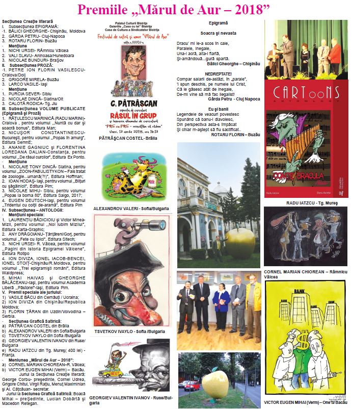 Se face vineri, 13 aprilie 2018! Zi fatidică pentru superstiţioşi. Nu şi pentru noi. Ne aflăm la Casa de Cultură a Sindicatelor. Cineva cu ceva fin bate ora 10 şi 13 minute. Se adună juriul concursului de creaţie literară. Pregătirile erau avansate. Manuscrisele şi volumele aşteptau să fie răsfoite. Tot ce a fost învălmăşit a fost ordonat. Întotdeauna, însă, unde-i multă ordine sunt şi multe scăpări. Manuscrisele şi volumele sosite pe adresa Festivalului au fost citite şi răscitite cu multe zile înainte, deoarece au fost puse din timp la dispoziţia membrilor juriului. Cornel Udrea le-a primit la Cluj, George Corbu la Bucureşti. Astăzi juriul avea o misiune mai simplificată. De stabilit ordinea ierarhică la manuscrise, adică se totalizează cele 5 note acordate de juriu, să împartă la 5 şi să rezulte media de concurs, după care se aşează mediile în ordine descrescătoare, se desigilează plicurile (casetele negre) cum obişnuim să le spunem. După aceste operaţiuni, aflăm numele autorilor câştigători. Simplu ca bună ziua. Apropo: Bună dimineaţa! Iată cum e reflectat Festivalul, structurile din care e format, în paginile cotidianului „Mesagerul de Bistriţa-Năsăud” nr. 6204, din 17 aprilie 2018; autor: Victor Ştir. La ediţia a 34-a a Festivalului Internaţional „Mărul de Aur” – 2018, juriul Secţiunii Creaţie literară, format din: George Corbu – preşedinte, Cornel Udrea, Grigore Chitul, Virgil Raţiu, Menuţ Maximinian, Alexandru Câţcăuan – secretar, a acordat următoarele premii: Secţiunea Creaţie literară,subsecţiunea Epigramă, Premiile „Mărul de Aur – 2018”: Gheorghe Bâlici (Chişinău, R. Moldova), Petru-Ioan Gârda (Cluj-Napoca), Florin Rotaru (Buzău). Menţiuni „Mărul de Aur – 2018”: Nichi Ursei (Râmnicu Vâlcea); Vali Slavu (Aninoasa, Hunedoara), Nicolae Bunduri (Braşov). Subsecţiunea Proză: Premiile „Mărul de Aur – 2018”: Petre Ion Florin Vasilescu (Craiova, Dolj), Mirela Grigore (Buzău), Vasile Larco (Iaşi). Menţiuni „Mărul de Aur – 2018”: Sever Purcia (Sibiu), Nicolae Dincă, Slatina (Olt), Calotă Rodica, (Târgu Jiu). Subsecţiunea Volume publicate (Epigramă şi Proză), Premiile „Mărul de Aur – 2018”: Marian Răţulescu (Radu Marini) din Craiova, pentru volumul „Nuntă cu dar şi soacră bonus”, Editura Man; Nicuşor Constantinescu din Bucureşti, pentru volumul „Popas în amurg”, Editura Semne; Ananie Gagniuc şi Florentina Loredana Dalean din Constanţa, pentru volumul „De râsul curcilor”, Editura Ex Ponto. Mentiuni „Marul de Aur – 2018”: Nicolaie Tony Dincă din Slatina, pentru volumul „Zoon-Fabulistykon” – „Fals tratat de zoologie... umană”, Editura Hoffman; Ioan Hodaş din Iaşi, pentru volumul „Bliţuri cu şăgălinci”, Editura Pim; Nicolae Mihu din Sibiu, pentru volumul „Popas la borna 80”, Editura Salgo; Eugen Deutsch din Iaşi, pentru volumul „Tridentul cu colţii de-aramă”, Editura Pim. Subsecţiunea Antologii, Menţiuni speciale: Laureniu Bădicioiu şi Victor Minea din Mizil, pentru volumul „Noi iubim Mizilul”, Editura Karta-Graphic; Any Drăgoianu din Ţânţăreni – Gorj, pentru volumul „Fete cu lipici”, Editura Sitech; Nichi Ursei din Râmnicu Vâlcea, pentru volumul „Pagini din istoria epigramei vâlcene”, Editura Rotipo, Iaşi, 2017, Ion Diviza, Ionel Iacob Bencei, Ionel Stoiţ (Chişinău – Republica Moldova), pentru volumul „Trei epigramişti români”, Editura Waldpress; Mihai Haivas şi Gheorghe Bălăceanu din Iaşi, pentru volumul „Academia Liberă «Păstorel»”, Editura Pim. Premii speciale ale juriului: Vasile Bâcu din Cernăuţi (Ucraina); Ion Diviza din Chişinău (Republica Molodova); Florin Ţăran din Uzdin (Voivodina – Serbia). La orele 11:13 minute juriul Concursului de Grafică Satirică compus din Mihai Boacă din Cluj-Napoca, preşedinte, Lucian Dobârtă şi Retegan Macedon din Bistriţa, membrii, au acordat: Premiile „Mărul de Aur – 2018”: Costel Pătrăşcan din Brăila; Alexandrov Valeri din Sofia – Bulgaria; Tsvetcov Ivaylo din Sofia – Bulgaria; Georgiev Valentin Ivanov din Ruse – Bulgaria; Radu Iaţcu din Târgu Mureş. Menţiuni „Mărul de Aur – 2018”: Cornel Marian Chiorean din Râmnicu Vâlcea; Victor Eugen Mihai (Verm) din Oneşti (Bacău). Şi s-a făcut ora 16 şi 13 minute. Toată suflarea, toţi horticultorii Mărului de Aur, ca într-o Cetate, de la opincă şi pantofi până la Rigă şi regenţi, sunt prezenţi la „Casa cu Lei”, din Bistriţa, bien sûr. (Doar noi, francofonii întotdeauna am fost prieteni cu bulgarii, care, şi ei, s-au declarat francofoni de Sofia.) Uite-aşa, îşi fac apariţia, pe rând, oficialităţile. Carevasăzică, sus-puşii. Este prima Ediţie a Festivalului de Râs fără Ştefan Popa’S. Graficianul. Marele. Ediţia a 34-a se deschide în prezenţa domnului Ovidiu Frenţ, prefect, Vasile Puica, vicepreşedinte al Consiliului Judeţean, George Corbu, preşedintele Uniunii Epigramiştilor Români, Cornel Udrea, scriitor de clasă, veşnic cu râsul în buzunare, Vasile Bâcu, profesor de la Cernăuţi, din Bucovina de Nord, preşedinte Societăţii „Mihai Eminescu”, însoţind o delegaţie de frăţietate: Vasile Barbu din Voivodina (Serbia), iar de la Chişinău, Gheorghe Bâlici şi Ion Diviza. În cuvântul său, prefectul a apreciat faptul că este o participare şi o prezentă extinsă a românilor din toate spaţiile româneşti de dincoace şi de dincolo de graniţe. Este firesc să fie aşa pentru că acest an este anul Centenarului Marii Uniri. Astăzi este şi o sărbătoare creştină importantă, a mai spus vorbitorul, şi astea dau garanţia că umorul, la Bistriţa, este din nou pe un făgaş bun. I se înmânează domnului prefect un Măr de Aur. Domnul vicepreşedinte Vasile Puica urează bun venit oaspeţilor la Bistriţa, felicită organizatorii şi pen