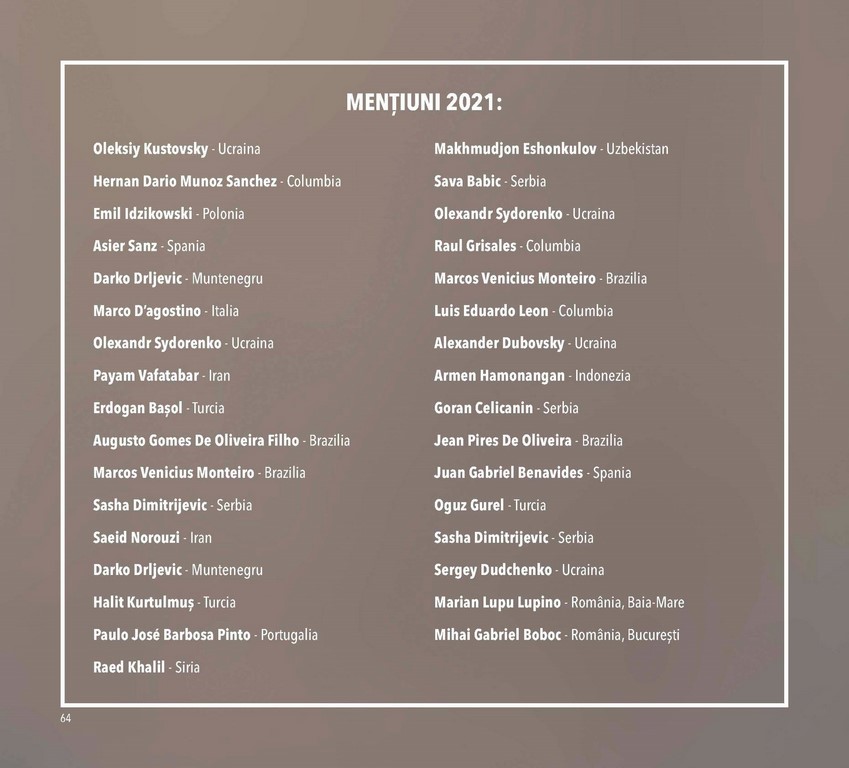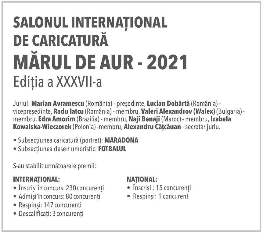 • Rezultatele obținute la secțiunea „Grafică satirică” - ediția a XXXVII-a a Festivalului Internațional de Satiră și Umor „Mărul de Aur”, ediție online, Bistrița, 2021: